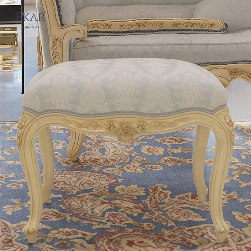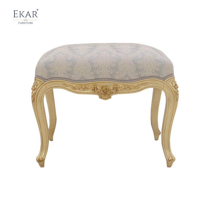 Authentic French Craftsmanship Inspired by 18th-century fauteuils, this stool features solid birch legs with intricate scroll carvings hand-sanded to silken smoothness. Cabriole legs terminate in refined pad feet, resting on brass floor protectors that prevent scratches.