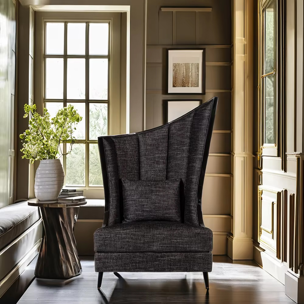Upgrade your living room with this classic high-back fabric lounge chair, featuring sturdy wooden legs and a comfortable design.