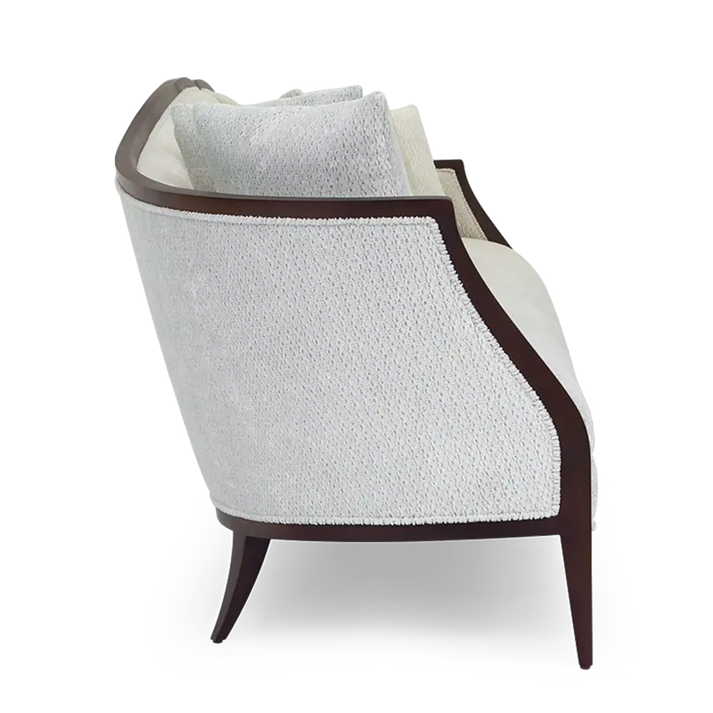 Upgrade your living room with this elegant American-style long sofa, featuring sturdy wooden legs and luxurious fabric upholstery for ultimate comfort.