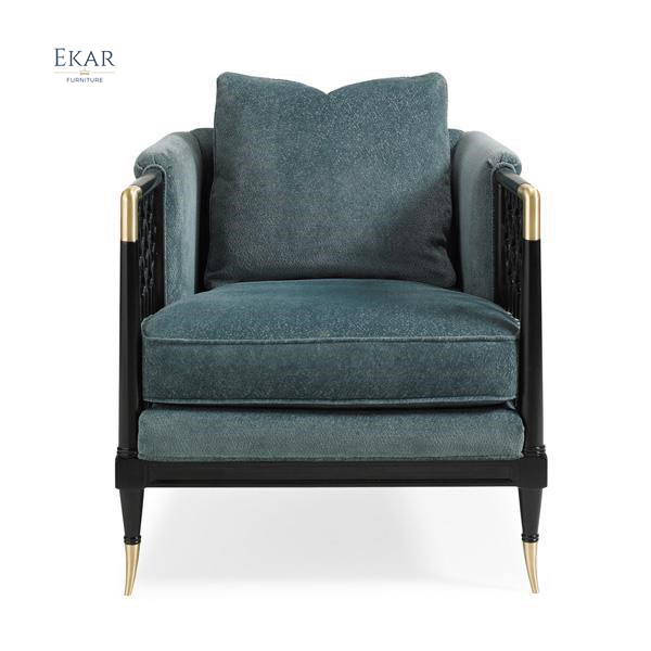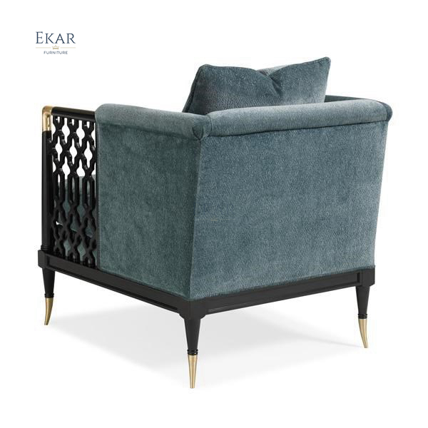 Elegant embroidered fabric was the starting point for this exposed wood frame, influencing the open fretwork design on each arm panel. The Tuxedo Black finish is further set off by matte brass plated metal accents and a lush textured fabric. Float this chair in a room in which you are able to take in all the sides, as we think it’s stunning from every angle.
