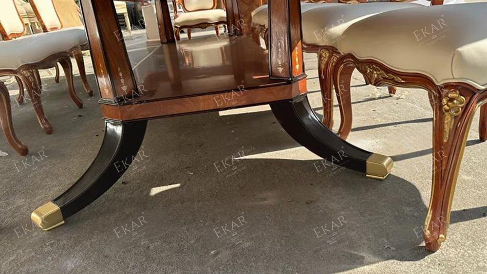 Ekar’s carved dining set combines elegant craftsmanship and luxurious wood, perfect for enhancing any classic dining room.