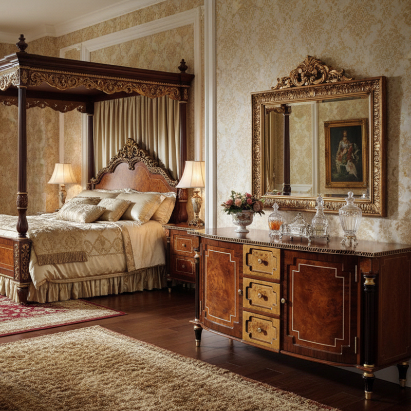 In terms of application, the EKAR Regency Heritage is specifically curated for grand master chambers, high-concept boutique hotel suites, and upscale residential dining rooms. Its unique profile allows it to function as a magnificent bedroom dresser or a prestigious dining room sideboard. In a bedroom setting, it pairs naturally with high-profile upholstered beds and traditional wall moldings to create a fully immersive luxury environment. Beyond the sleeping quarters, its sophisticated profile makes it an ideal buffet for a formal dining hall, where it can display antique silver or fine crystal. For interior designers sourcing from a Foshan export furniture factory, this piece provides a versatile foundation that works harmoniously in traditional British or more eclectic, "Old World" interior themes.