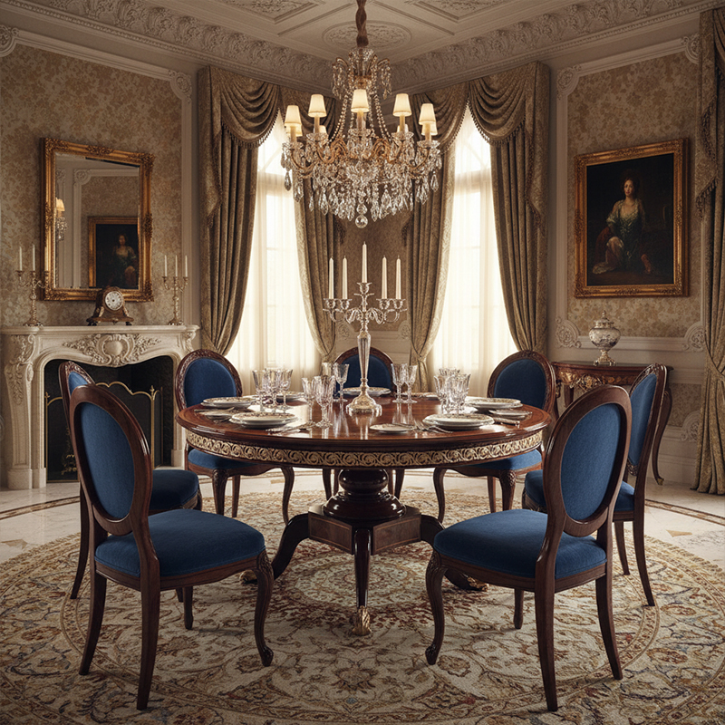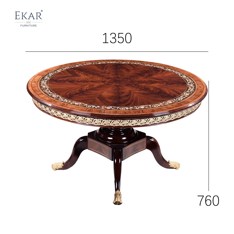 In terms of application, the EKAR Royal Crescent is specifically curated for grand manor dining rooms, high-concept boutique hotel suites, and upscale residential breakfast nooks. Its unique circular profile allows it to fit gracefully into octagonal, square, or specialized dining chambers, making it an ideal choice for rooms where maximizing visual flow while maintaining a high-status aesthetic is a priority. As a central component of high-end customized furniture, it pairs naturally with velvet-upholstered dining chairs and ornate crystal chandeliers to create a fully immersive luxury environment. For interior designers sourcing from a Foshan export furniture factory, this dining table provides a versatile foundation that reflects a cohesive sense of personal success and refined taste.